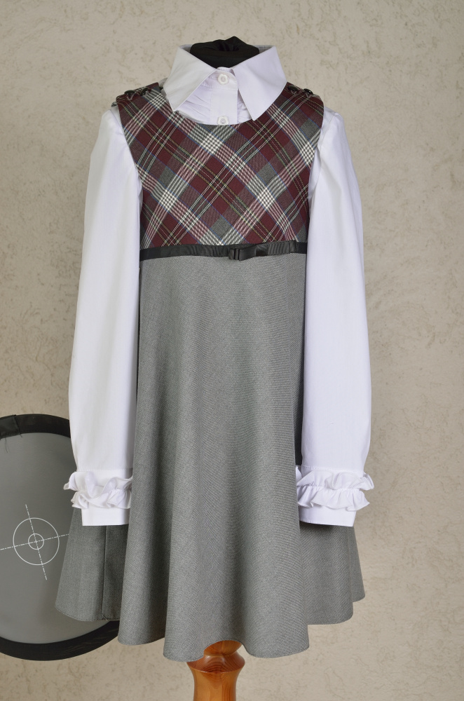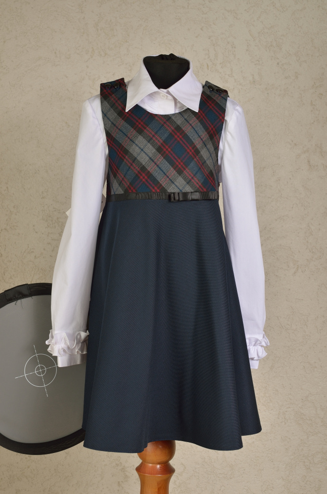Красивый расклешенный сарафан для девочек младшей школы. Удобен в повседневной носке. Сарафан простого классического кроя, из костюмной ткани с клеткой, с лаконичной верхней частью. Вся уникальность и изюминка модели достигается фасоном юбки. Лиф украшен декоративным бантом.