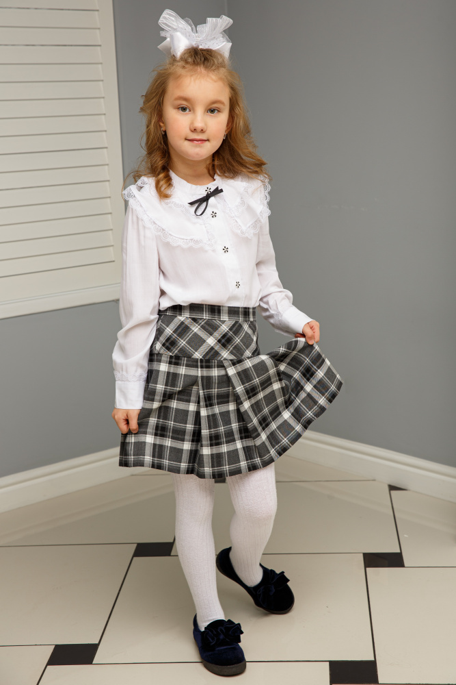 Юбка для девочек младшего и среднего школьного возраста. Выполнена из смесовой ткани в клетку. Данная модель на широкой кокетке, выкроенной по косой, с широким запахом, застегивающимся на замок с пуговицей. Передняя и задняя половинки юбки с односторонними частными складками.