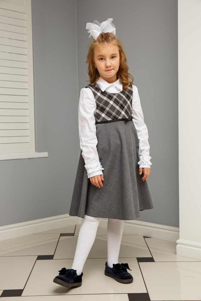 Красивый расклешенный сарафан для девочек младшей школы. Удобен в повседневной носке. Сарафан простого классического кроя, из костюмной ткани с клеткой, с лаконичной верхней частью. Вся уникальность и изюминка модели достигается фасоном юбки. Лиф украшен декоративным бантом.