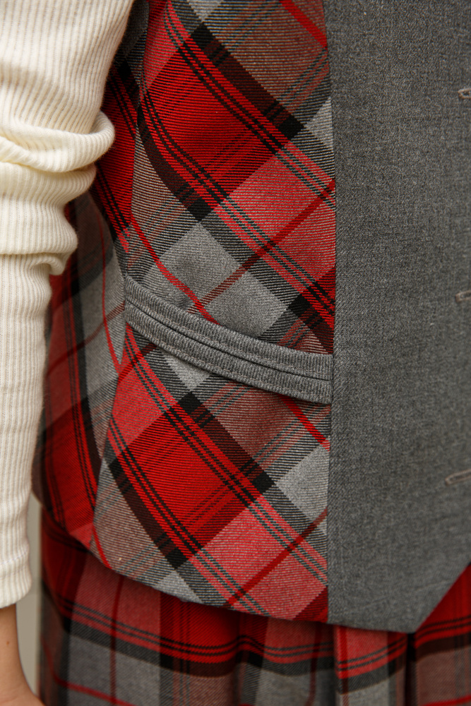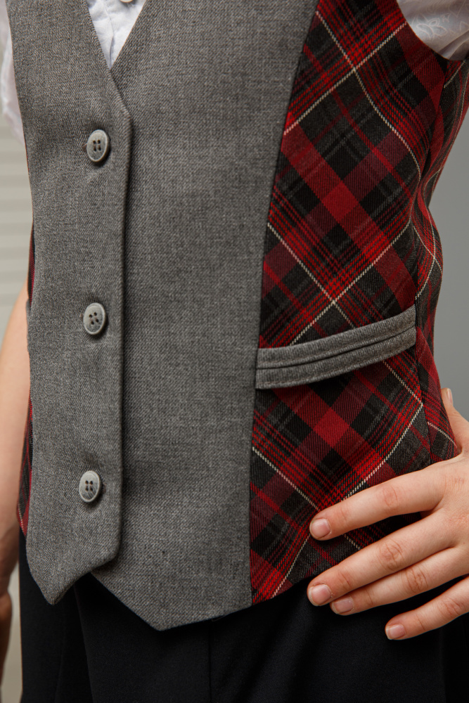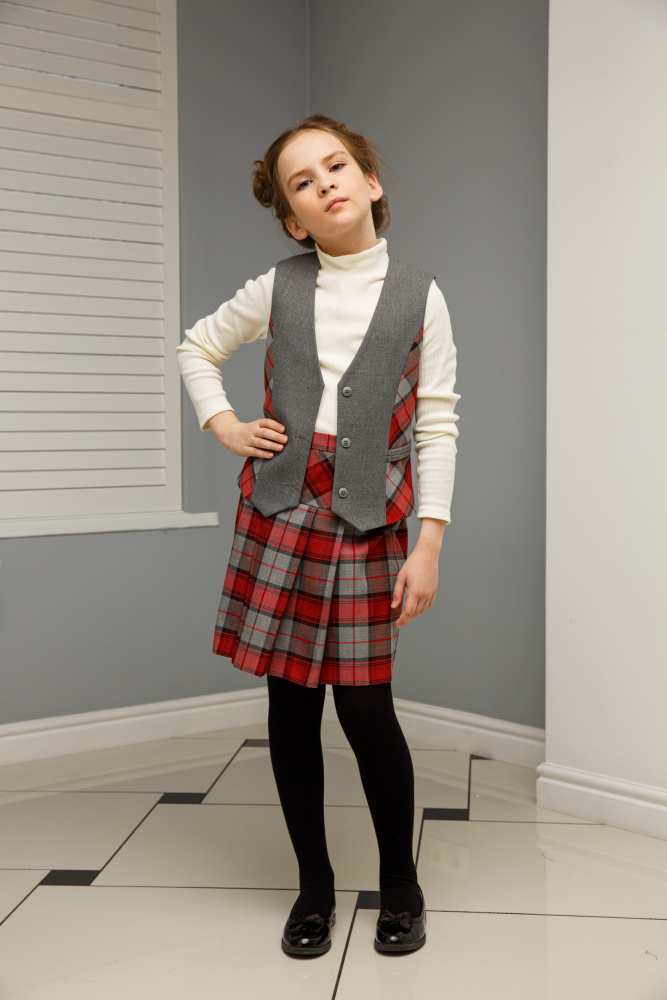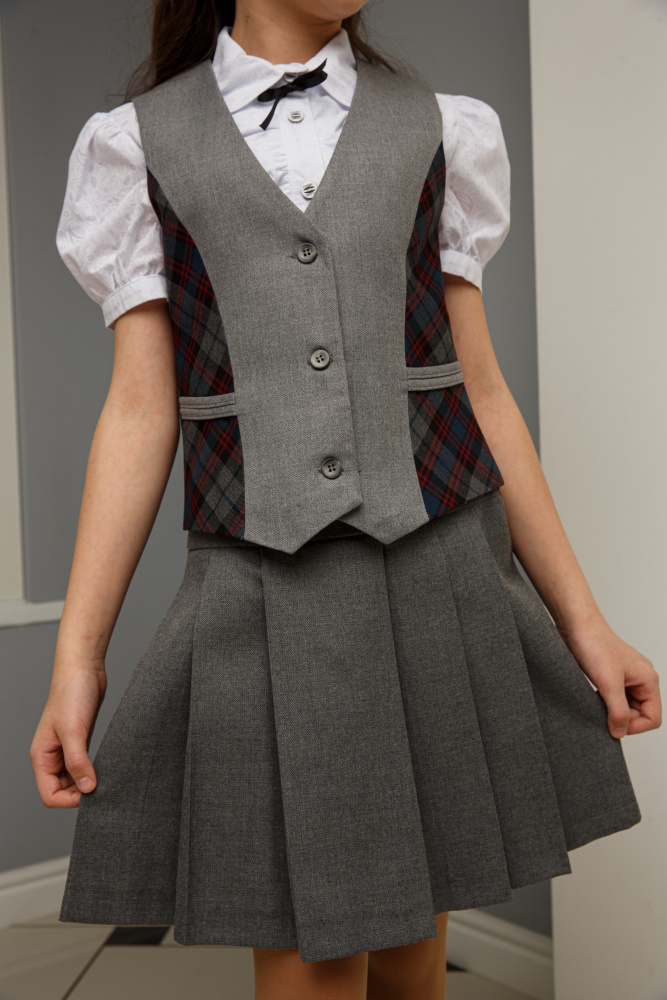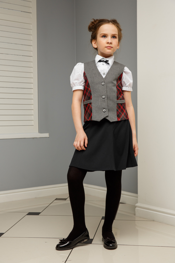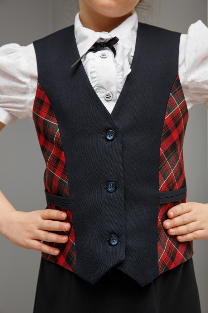 Классический строгий жилет из базовой коллекции станет лучшим помощником при создании школьного образа девочки. Выполнен из костюмной ткани на подкладке. На полочке рельефные швы отделаны кантом из ткани в клетку. Он может стать прекрасной альтернативой пиджаку, кардигану, жакету, делая образ девочки не менее строгим и деловым. С блузкой и водолазкой жилет создаст достойный комплект для будней школьницы.